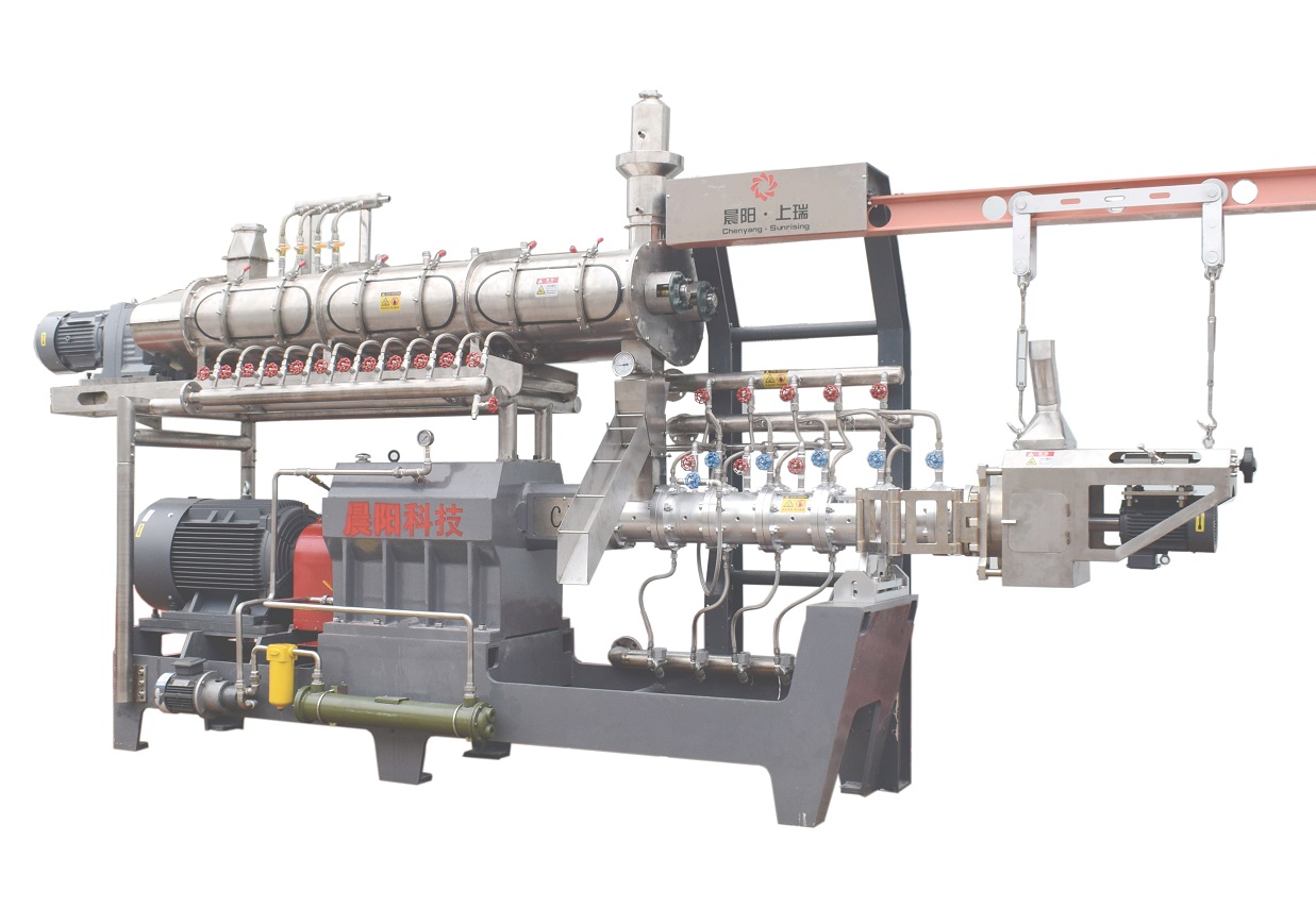 6.加 水進(jìn) 入擠 壓 機(jī) 是 為 了 更 好 的 調(diào) 和, 如 果 加 水 過 度 就 會 使 產(chǎn) 品 有 小 尾 巴, 結(jié) 塊 和 產(chǎn) 品 的 相 互 粘 結(jié)。 達(dá)到12%的 水 可 以 加 入 擠 壓 機(jī)( 正 常8% 多 一些), 達(dá) 到1% 的蒸 汽 可 加 入 擠 壓 機(jī)。
