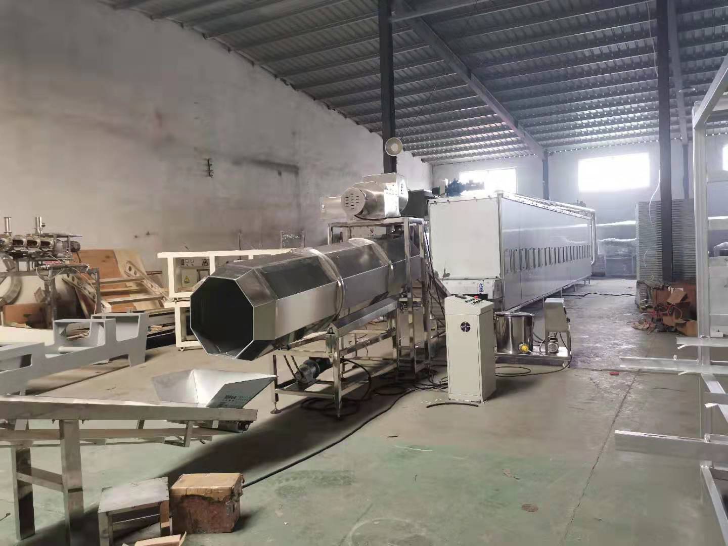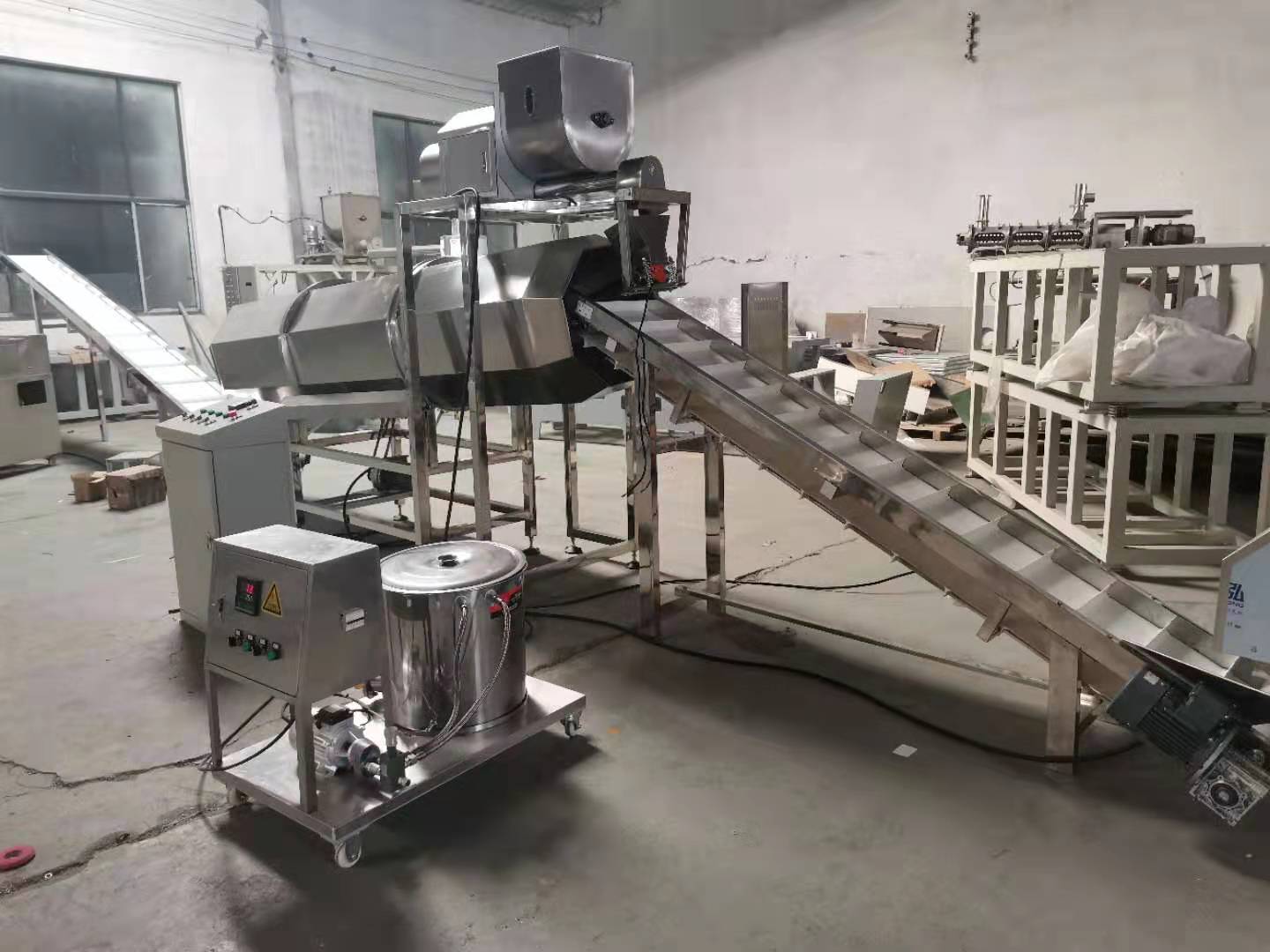 一、工藝流程: 原料配制→拌粉→輸送→擠壓膨化→注芯→整形切斷→輸送→干燥→噴油→調(diào)味→(包裝)