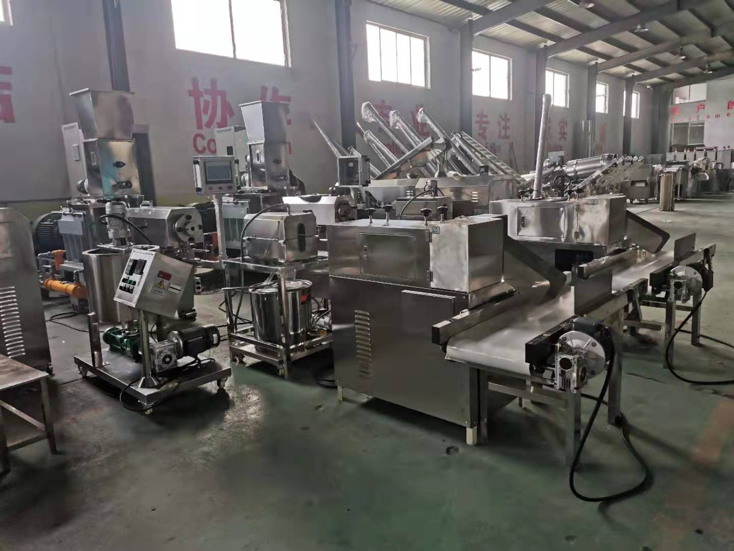 二、設(shè)備配置: 拌粉機→上料機→膨化機→注芯機→整形切斷機→提升機→多層烤箱→提升機→噴油機→滾筒→(包裝機)