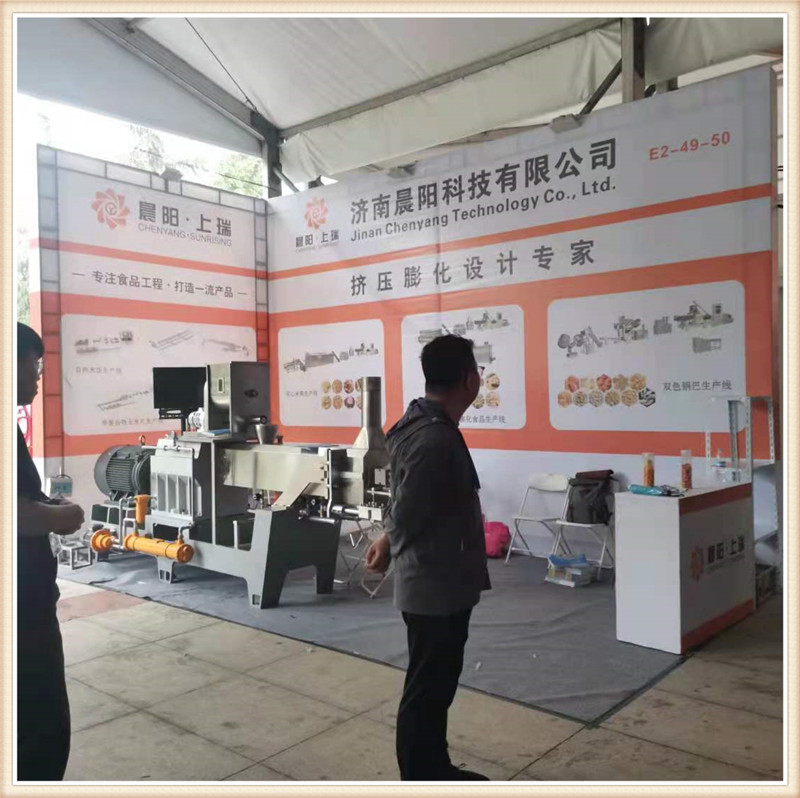 濟南晨陽公司攜帶新款CY65雙螺桿膨化主機亮相第19屆漯河食品博覽會,一經亮相,變引起了眾多膨化食品生產企業(yè)的關注咨詢。詳細詢問該新款機型的性能特點,和核心產品加工。該款65主機搭載45kw-6級電機直連傳動,齒輪箱使用原裝南京擠出機箱體,螺桿使用分段積木組合結構,機桶使用內壁噴涂耐磨襯套材料。機桶恒溫控制,PLC自動控制,切割模頭升級。