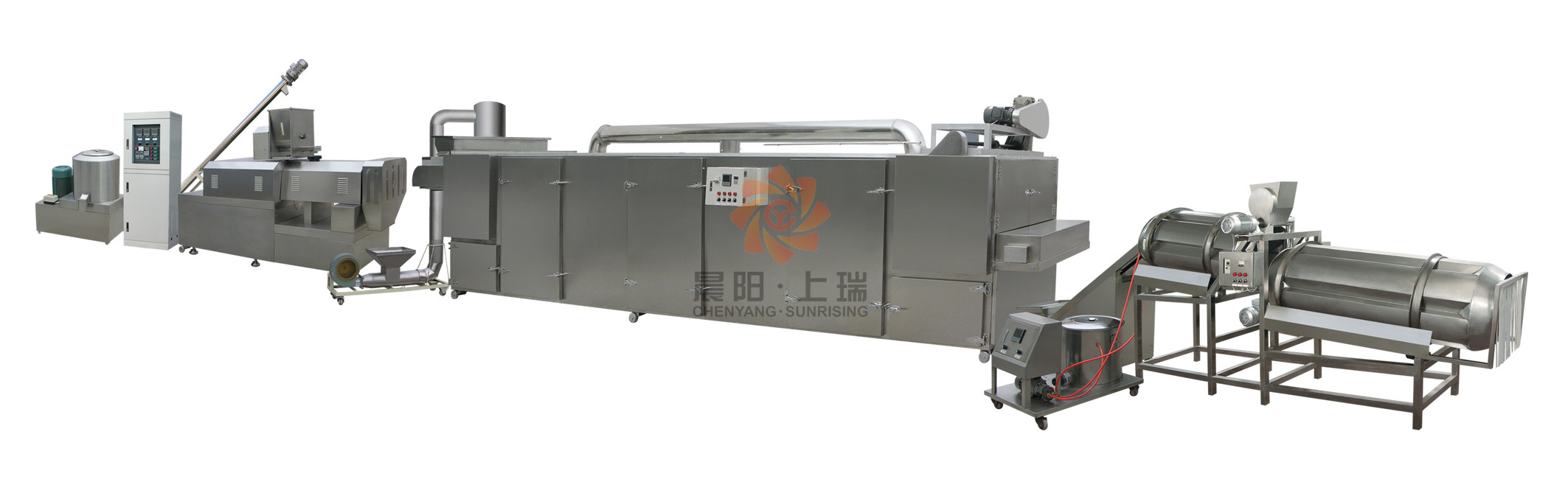 大家都知道:傳統(tǒng)的膨化狗糧顆粒,主要原料是淀粉類的谷物,主要是玉米,肉類超過了一定比例,就不能夠膨化成型,做出來的形狀就不夠美觀。所以,用傳統(tǒng)擠壓膨化工藝的設備生產(chǎn)出的狗糧顆粒,只能是低蛋白高淀粉類的顆粒。不能夠生產(chǎn)出高蛋白的狗糧顆粒,針對以上原因和市場需求的現(xiàn)實,我們濟南晨陽科技有限公司,研發(fā)出一整套純?nèi)夤芳Z機器設備生產(chǎn)線,只為滿足高端狗糧需求者的客觀需求。