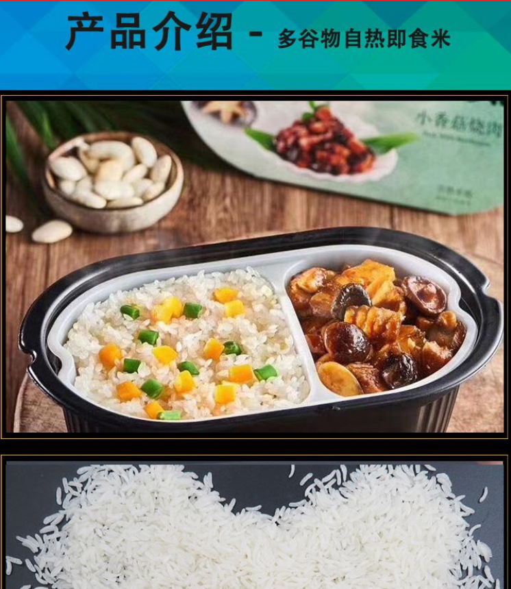 方便自熱米飯主要由主食大米、佐餐菜料、調(diào)味料三部分組成。其種類很多,按加工方法的不同來分,可分為速煮米飯(α化米飯)、罐頭米飯、軟罐頭米飯(蒸煮袋米飯)、無菌包裝米飯、冷凍米飯、冷藏米飯和干燥米飯七大類。根據(jù)食用方式可將方便米飯分為兩種:一種是脫水干燥米飯,即經(jīng)脫水干燥處理的米飯產(chǎn)品,這種產(chǎn)品在熱水中復(fù)水?dāng)?shù)分鐘后即可食用。脫水干燥米飯分為儀化米飯、冷凍米飯、膨化米飯等。另一種是成品米飯,即非脫水干燥米飯,這種產(chǎn)品食用前無需復(fù)水,打開包裝即可食用,食用前也可先加熱 。