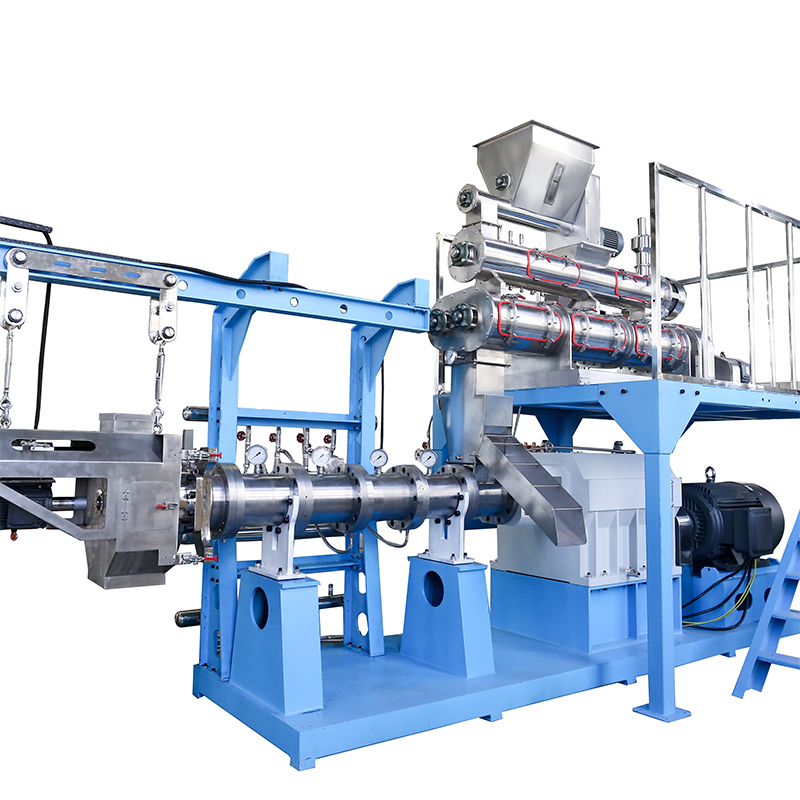 膨化:混合后的物料進(jìn)入雙螺桿擠壓膨化機(jī)。在高溫高壓的條件下,原材料中的淀粉被膨化并轉(zhuǎn)化為可消化的形式。膨化機(jī)通過調(diào)節(jié)旋切電機(jī)的轉(zhuǎn)速,可以控制飼料顆粒的大小和形狀