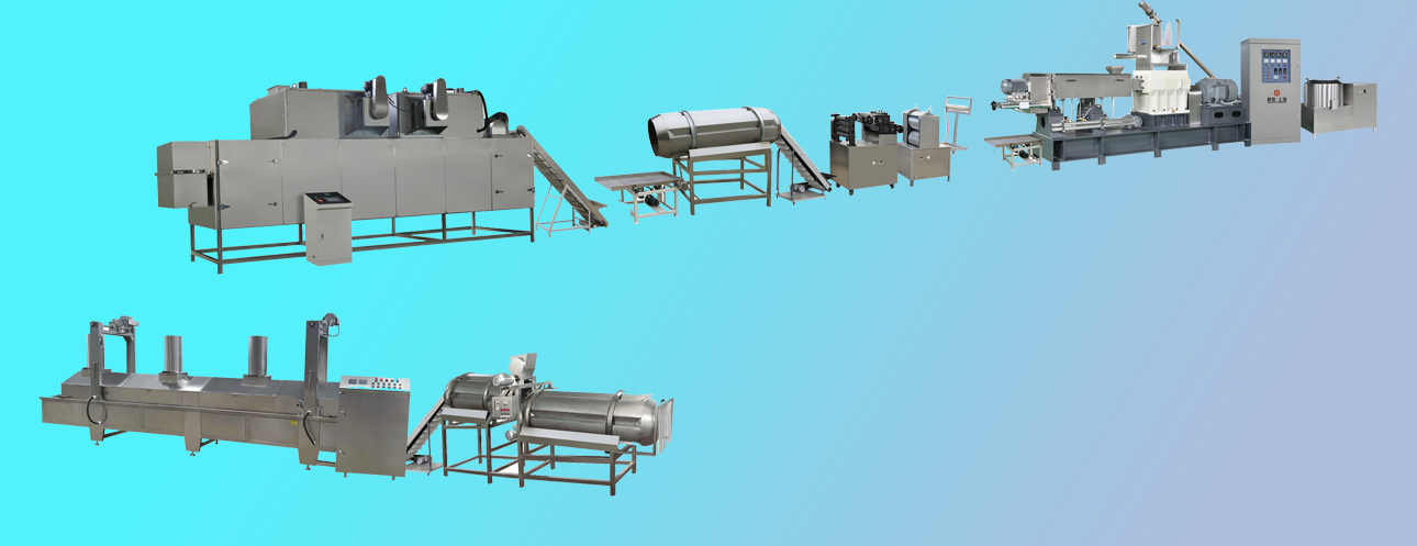 拌粉機(jī)→真空上料機(jī)→雙螺桿膨化機(jī)→展平冷卻機(jī)→整形切斷機(jī)→提升機(jī)-篩選機(jī)-提升機(jī)-八米五層干燥機(jī)-油炸機(jī)-震動脫油機(jī)-單滾筒調(diào)味機(jī)