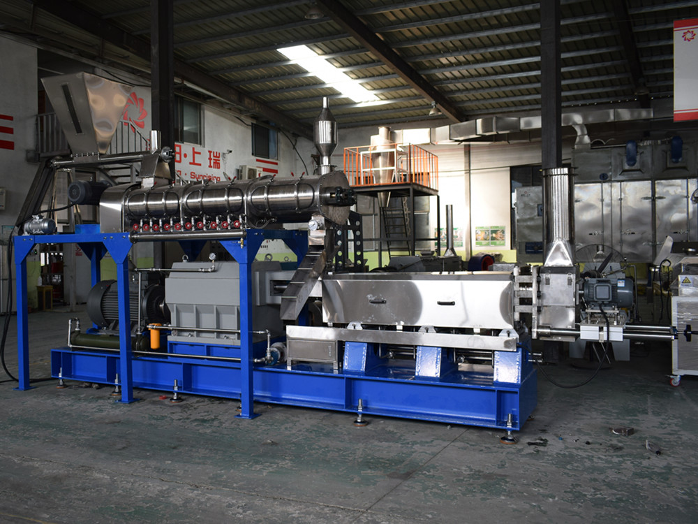雙螺桿膨化機(jī)由供料系統(tǒng)、擠壓系統(tǒng)、旋切系統(tǒng)、加熱系統(tǒng)、冷卻系統(tǒng)、傳動(dòng)系統(tǒng)、控制系統(tǒng)組成。該機(jī)適用原料廣泛、生產(chǎn)產(chǎn)品多樣,變頻調(diào)速、自動(dòng)化程度高、運(yùn)行平穩(wěn)、使用壽命長(zhǎng)。