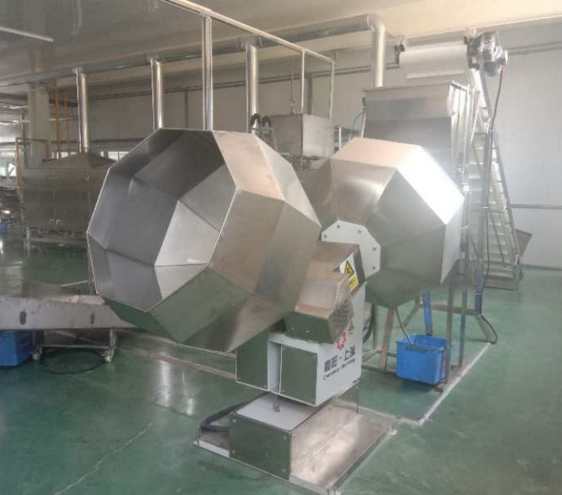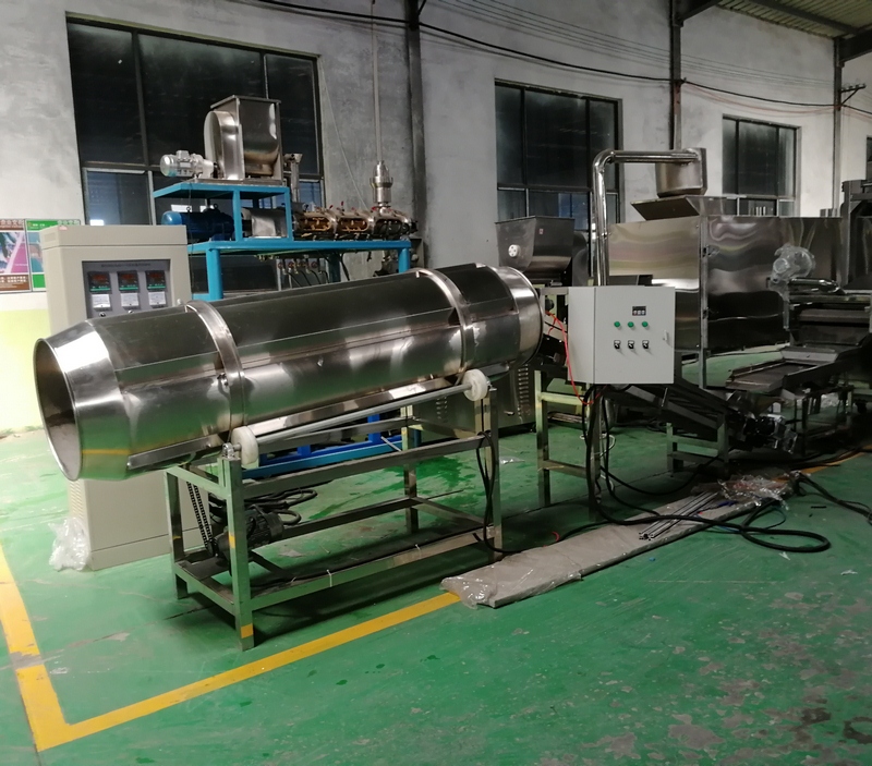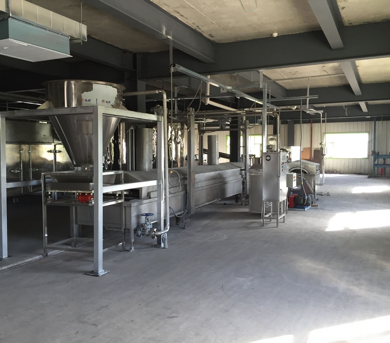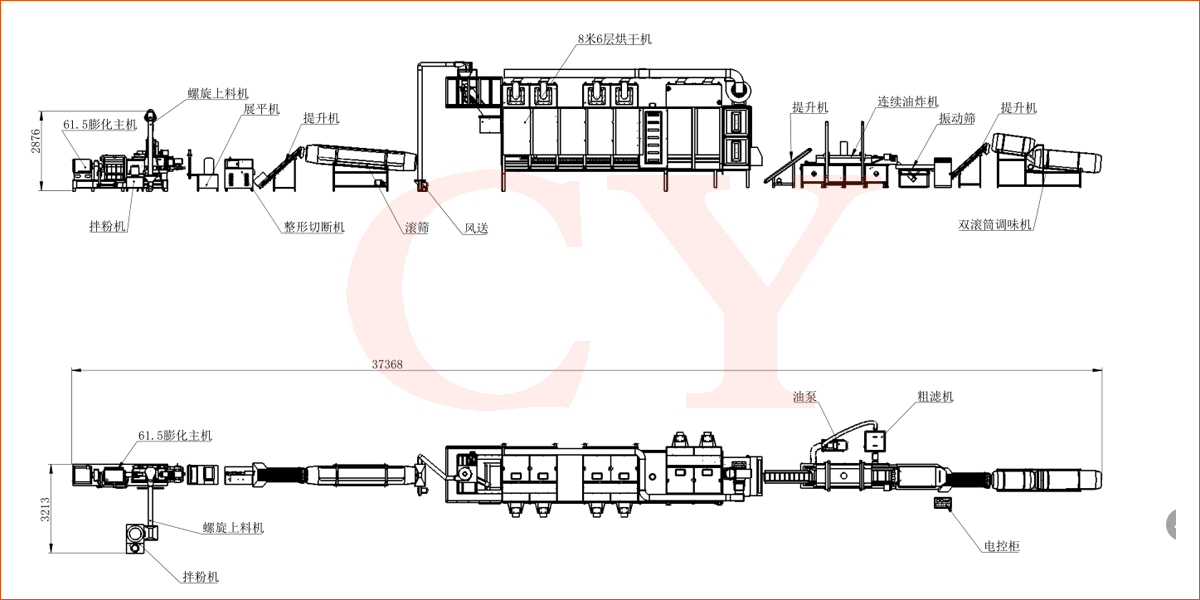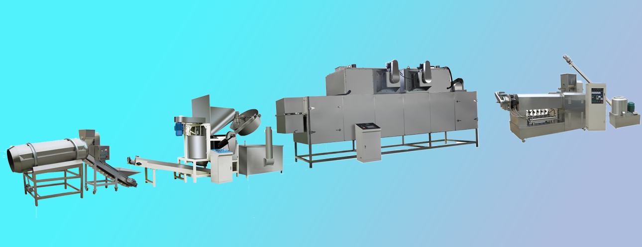 拌粉機→皮帶上料機→單螺桿擠出機→-提升機-八米五層干燥機-油炸機-震動脫油機-單滾筒調味機